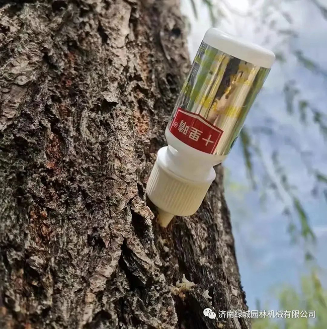 使用八方生态的十里晴,每袋稀释后装入直插瓶,打孔插入,10公分树木用一支,依次递增。