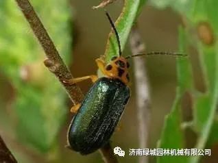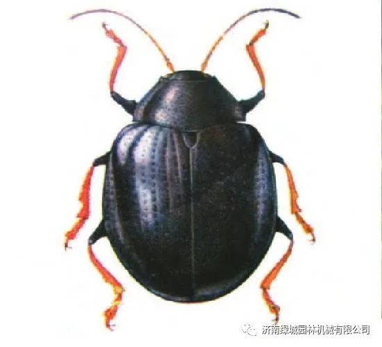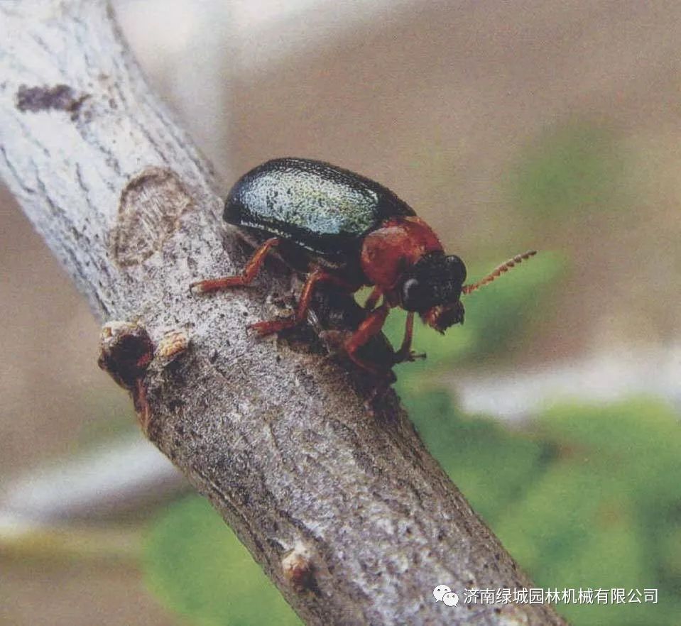 一、榆绿毛萤叶甲:危害榆树。一年2代,以成虫在枯枝落叶和缝隙中越冬。4月中旬成虫开始活动。