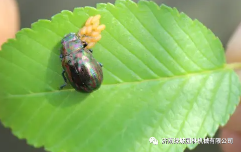 二、榆黄毛萤叶甲:一年2代,以成虫越冬。4月下旬成虫活动,产卵于叶背,每卵块有约20粒,每个雌虫可产卵四五百粒,卵期约10天,幼虫期20多天。10月初开始准备越冬。