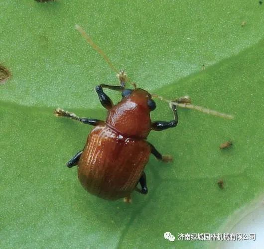 十、李叶甲:危害桃树、李树、蔷薇、月季、栎树、梨树等。一年一代,6-8月成虫期,成虫幼虫取食叶片造成缺刻。