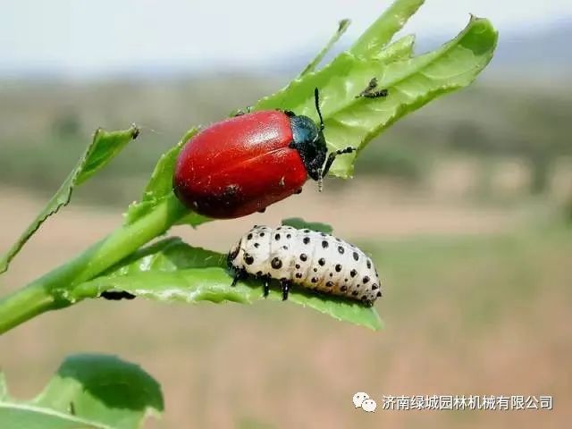 六、杨叶甲:危害杨树、柳树。一年2代,以成虫在枯枝落叶处或表土层越冬。4月下旬上树,5月上旬产卵,6月下旬第二代成虫出现,盛夏入土休眠,8月下旬飞出取食。