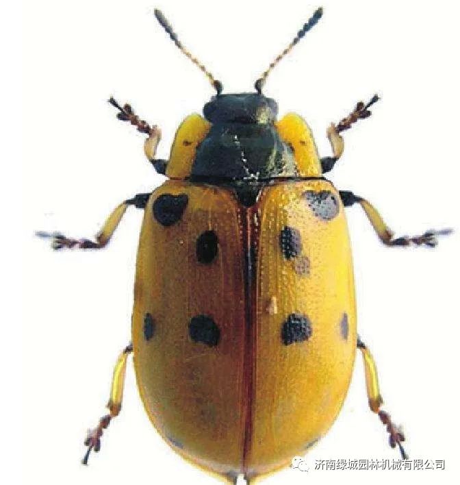 八、柳十八斑叶甲:危害柳树。一年2代,以成虫越冬。4月上中旬,杨柳树发芽放叶时出蛰,4月下旬至5月上旬幼虫孵化,7月上旬危害盛期,10月下旬下树越冬。