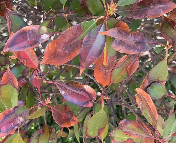 红叶石楠常见问题:新叶卷曲皱缩,黄化、叶片边缘干枯,叶片大块斑枯、落叶等。