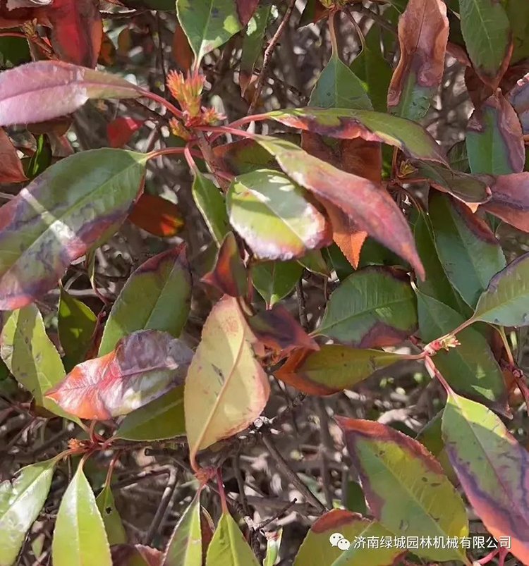 4、其他原因:红叶石楠叶片局部干枯、落叶等情况,如果遇到极端降温,造成冻害,冬季防寒做的到位,暖冬影响,也会导致叶片干枯。济南区域冬季无需做防护。落叶干枯等情况在新栽小苗上出现较多,主要是栽植季节不对,高温干旱等影响,或者小苗抗性弱,冬季容易受冻导致干枯、落叶等。