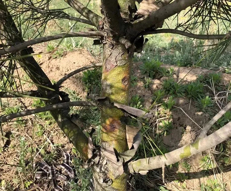 二、腐烂病(烂皮病):导致枝枯、树势衰弱甚至死亡,多种植物受害,树皮腐烂,有液体流出。还有溃疡病、流胶病,都在枝条和树干上发病,容易识别。一旦发现及时防治,使用透翠干腐病套装或禾林道腐烂病套餐喷雾,秋季春季树木涂白都可以预防。这个也是一种危害较大的病害,注意防治。