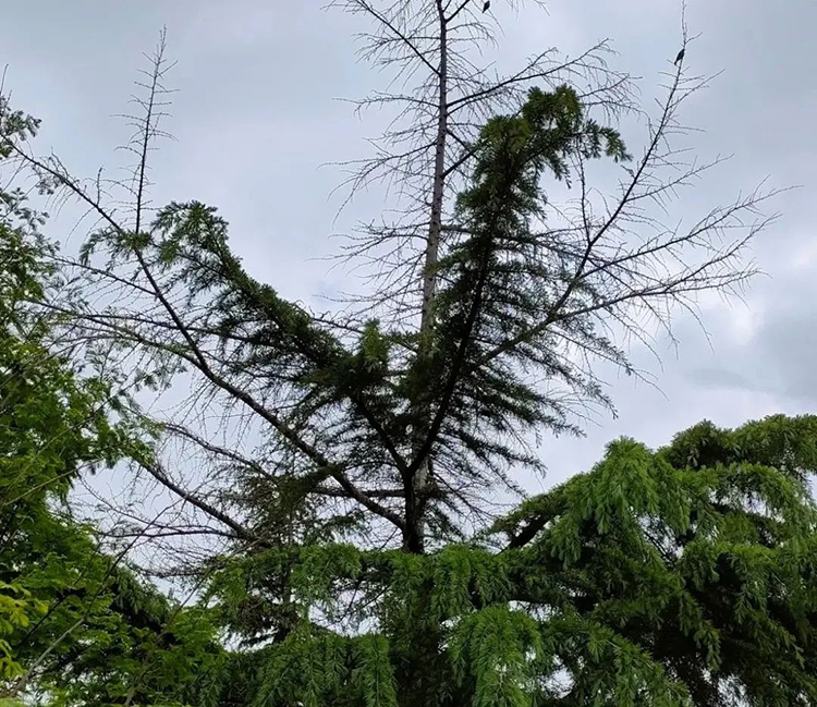 8、针枯病:多发生在5月中下旬,由病原真菌侵入、侵染树枝,造成树枝干枯、顶梢松针稀疏。病害易侵染生长弱的枝叶或嫩叶,表现为梢部新针叶数少且短,秃梢而枯。湿度大极易大规模爆发。