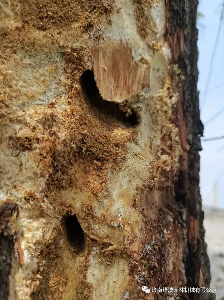 二、天牛:从3月开始危害,5月中旬开始陆续羽化,成虫一般在5月底到6月份是羽化盛期,成虫枝条啃食树皮,在树干下部产卵,孵化后幼虫钻入韧皮部危害,逐步深入木质部。天牛幼虫危害严重,导致济南多地柳树出现干枝,顶部枝条全部死亡,甚至整株死亡,拨开树皮,可见里面危害是多么的严重。幼虫危害时间3-10月,成虫在5-8月较为集中。