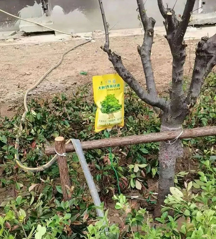 2、浇灌定根水时,配合根司令和奇根一起浇灌,定根水一定要浇透,间隔3-5天浇灌第二次水。树体直接输液,不用犹豫,考虑成本的话直接使用空袋子+禾林道浓缩液自己兑,输液是必须的。
