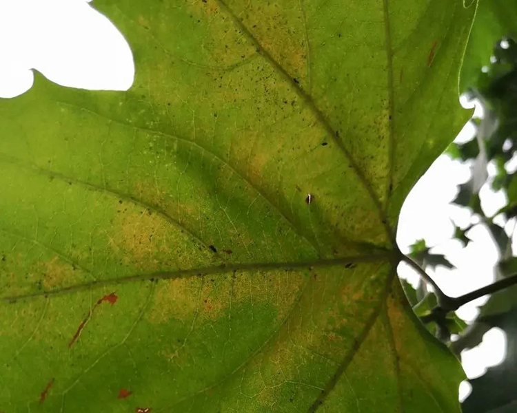 近期在济南部分区域,发现法桐叶片叶柄部位发黄,进过诊断,是方翅网蝽危害导致,初期危害叶柄,逐渐扩大危害范围,在叶部背面可以见到危害的害虫。