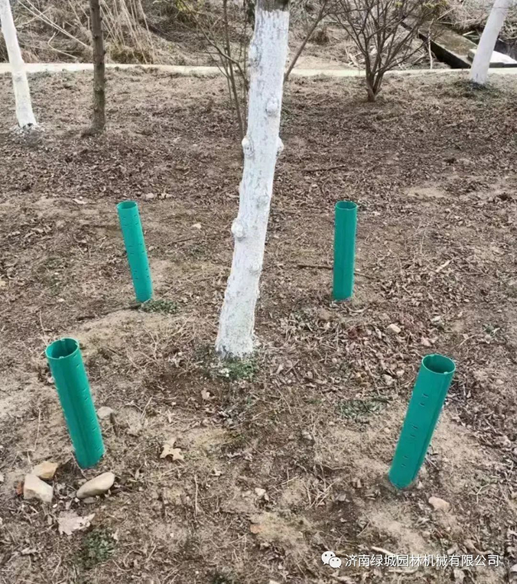 3、定植后,填土压实,避免下部悬空,浇定根水,可以浇灌1-2次,确保浇透,但不能有积水。所以可以提前在土球周边埋透气管,让多余的水分可以蒸发掉,同时可以保证后期能浇透水。浇灌定根水时可以和生根液杀菌剂一起浇灌,也可以第二次浇水时使用。