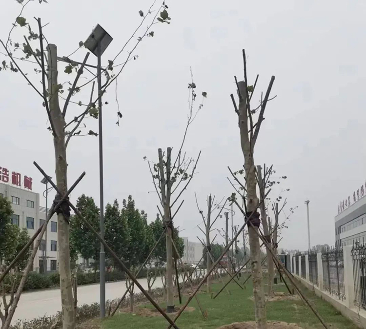 1、浇完定根水后,进行树木固定支撑,确保夏季风大时树体的稳定,摇树必死,所以固定好树木也很关键。