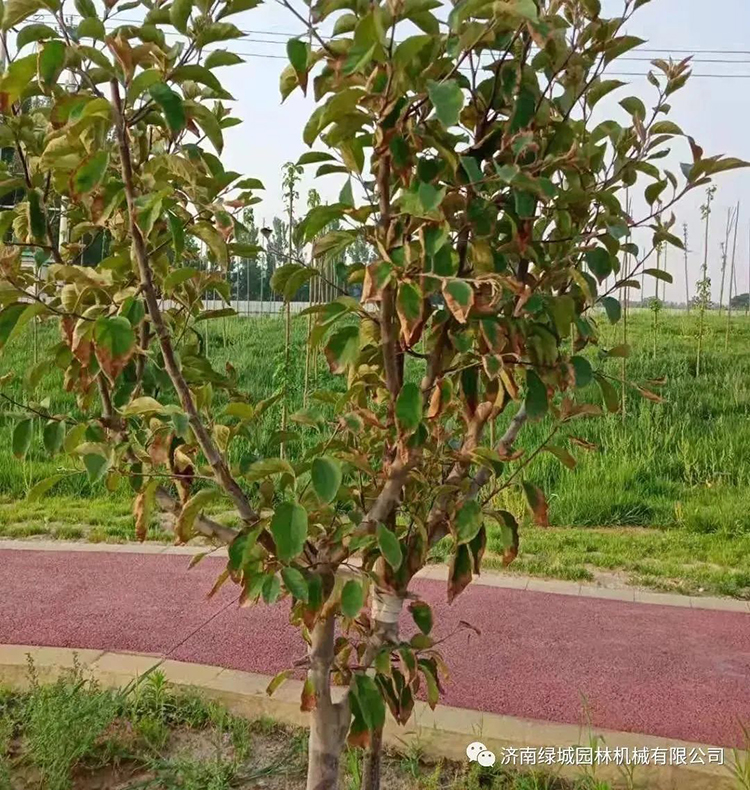 四、新栽苗木:还未缓苗,没生根或少量生根。一旦遇到积水,根系很快失去活力。所以对新栽苗木来讲,也是我们重点关注对象。除了及时排水外,注意晾根处理,先输液,天气晴朗时可以遮阴处理或喷施抗蒸液,减少水分蒸发,输液可以补充水分营养,维持相对平衡。晾根后进行复壮,使用根司令、地彩、奇根、根壮壮等浇灌根部。