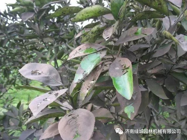 煤污病又称煤烟病,其症状是在叶面、枝梢上形成黑色小霉斑,后扩大连片,使整个叶面、嫩梢上布满黑霉层。呈黑色霉层或黑色煤粉层是该病的重要特征。