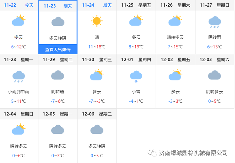 时候到了,该冷的就会冷。根据天气预报预测,近期气温会呈现先上升后下降的趋势,从最高19°C左右至本月29号的零下3°C-7°C,进入12月份最高气温维持在几度,最低气温零下7°C,后至0°C左右徘徊。市区温度高于外围,所以不同区域,防寒保温措施也不同。当然了,天气可能会随时发生变化,但气温的下降是肯定的,只是幅度可能大或小而已。在园林绿地养护中,近期主要工作要注意以下几点:
