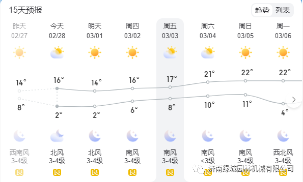 根据天气预报,3月份济南气温特点:早晚温差大,先升温再降温再升温的反复,最高可达26°C,最低气温0°C左右,风大、干旱少雨、温差大是本月的气候特点。根据气温变化和实际园林养护需要,3月份主要园林病虫害和杂草防治以及栽培养护管理的具体措施如下: