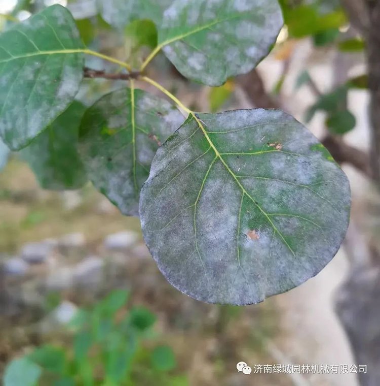 表现:初期叶片表面出现白粉病斑,用手可擦拭掉,病斑逐渐增多,严重时可连接成片,叶背面、嫩枝都会受害,布满白粉。导致叶片卷叶皱缩、枝梢扭曲变形,造成叶片干枯落叶甚至枯死。