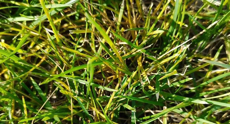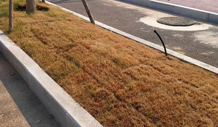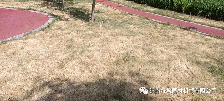 3、新播种草坪发黄白化枯死。原因:根腐病、立枯病等导致,还有高温日灼导致,特别是草坪土质不好的区域容易发生。