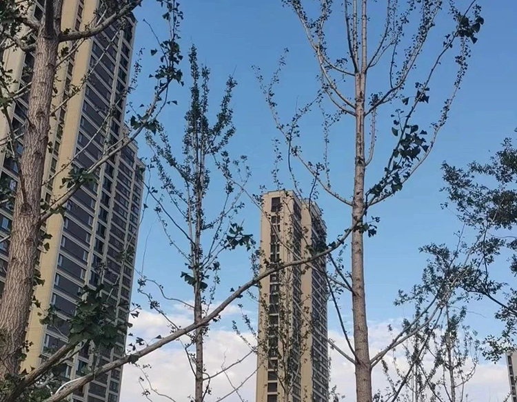 4、银杏:存在叶小、稀疏,长势不旺的情况。主要还是土壤问题导致。采取根部复壮,树穴更换营养土、有机质、墨园宝等,打透气孔,调节盐碱,浇灌根司令、奇根等,配合树体输液,效果较为明显。