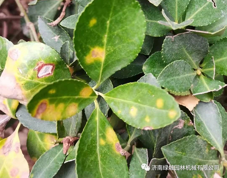 2、大叶黄杨叶斑病:发病初期,主要发生在新叶上,叶片上产生黄色小斑点,逐渐变为黄褐色,扩大为圆形或不规则形病斑,后期病斑为灰褐色或灰白色,边缘色深,一般6月份开始侵染,7、8月份为侵染盛期,8月中下旬至9月份发病严重,病斑扩大,出现落叶。
